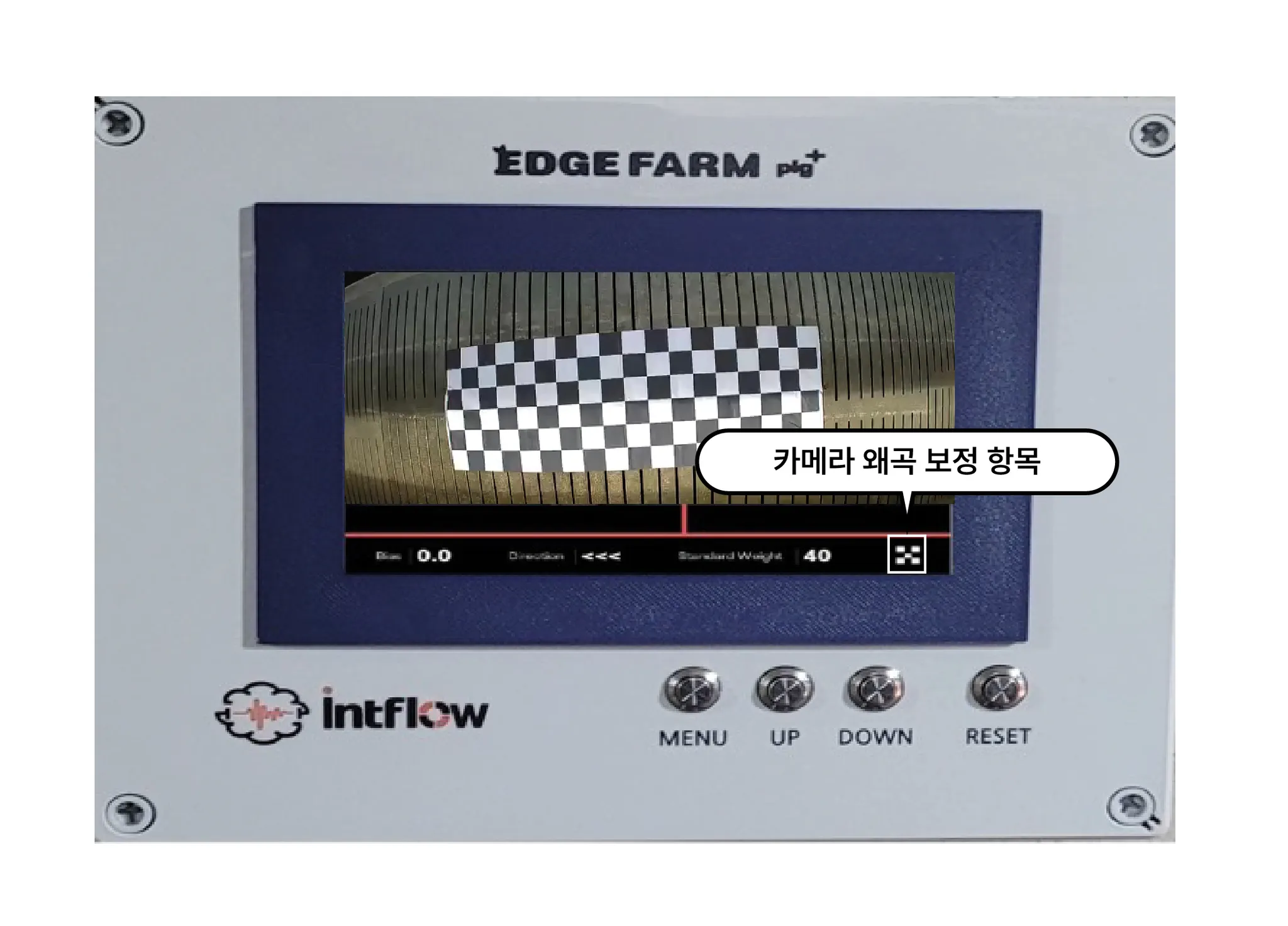 ‘카메라 왜곡 보정’은 약 1분 정도 시간이 소요되며 보정에 성공하면 아래 사진과 같은 화면이 출력됩니다. 아래 화면에서 버튼 (UP)을 누르면 잠시 후 ‘EdgeFarm running’ 메시지와 함께 기기가 재부팅됩니다. 재부팅 이후에는 보정이 완료된 상태입니다.